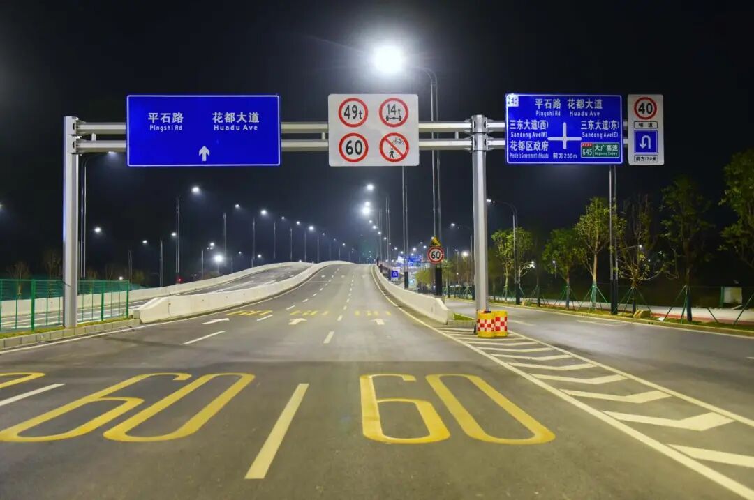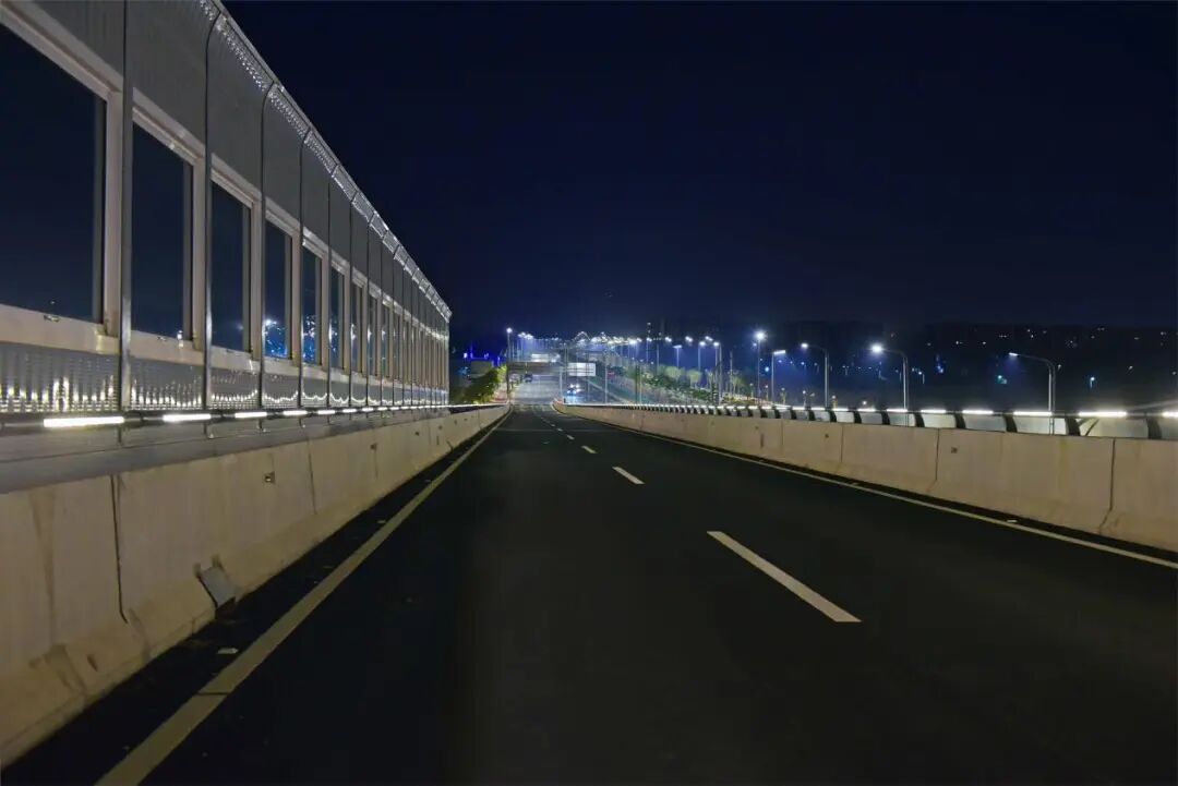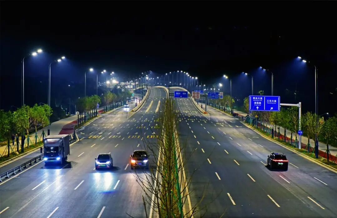 新花大道(花都大道-商业大道)主线运用高杆节能照明灯并配备智能控制系统,可以实现对路灯的整体控制;与花都大道交接的匝道处使用护栏灯,光亮但不刺眼。近看,光影柔和,勾勒出道路的流畅线条;远望,则成一幅浩然的夜色画卷:天幕蓝韵静谧,道路铺展为车流有序的金色光河,周边楼宇灯火如星辰散落,三者交融——天际沉静、道路川流、建筑闪烁,共同呈现出花都深稳澎湃的新气象。