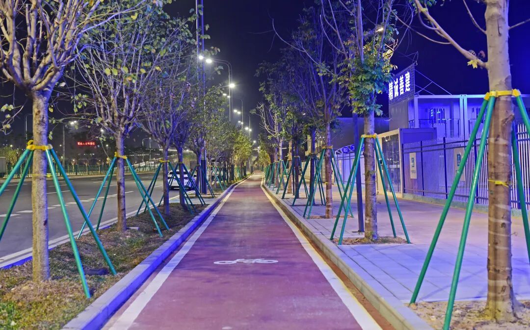 新花大道(花都大道-商业大道)不仅是一条交通干道,更是一条生态景观廊道。沿线绿化工程精选本土适生乔木,道路中线以凤凰木、苦楝为主,道路两侧以仁面子和宫粉紫荆为主,同时搭配翠芦莉、肾蕨、紫花勒杜鹃盆摘等植物,形成了“一路通行,场景鲜明”的景观特点——绿树高大、地被低伏,层层递进;四季色盘实现从春粉、夏红流转到秋紫、冬青的多彩变幻,绚烂而静谧。这一立体画廊有效提升了城市形象与生态品质,展现了现代化花都的独特魅力。